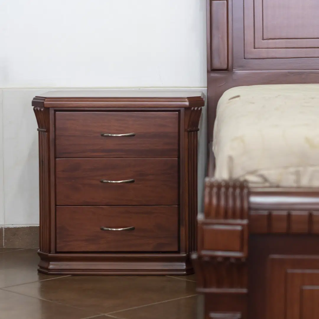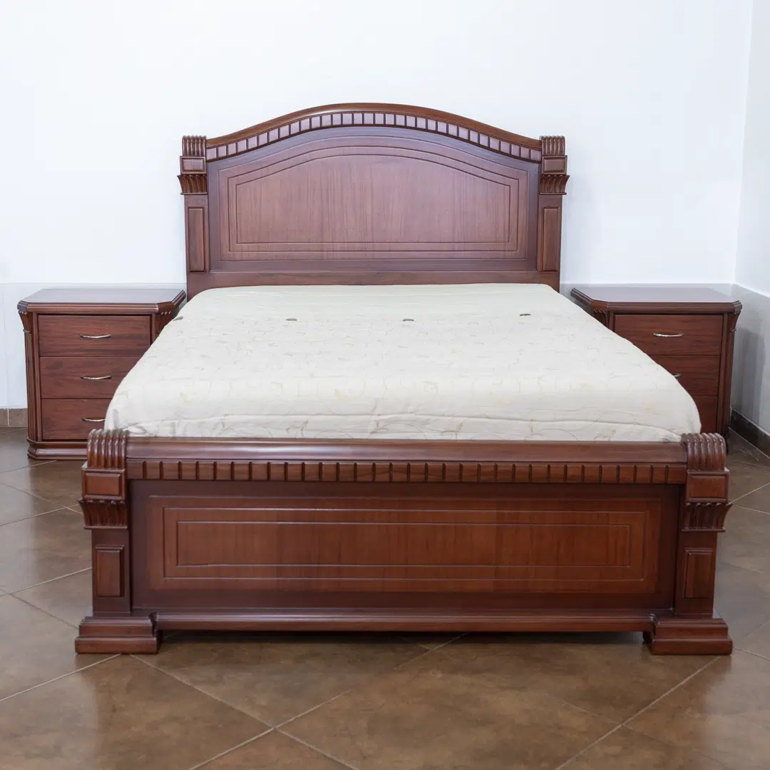 La Cama Española de 2 ½ Plazas combina madera sólida de Laurel Negro, tallados artesanales y el sistema “Luna de Miel” antimaqueo, con dos veladores a juego que completan su elegancia.